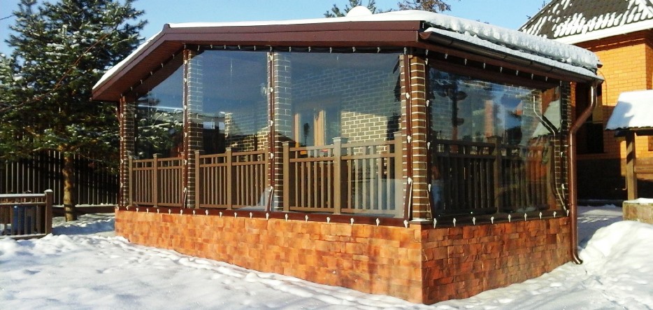 - Гибкость и эластичность. Мягкие окна могут быть установлены на любой форме проема, что делает их идеальными для оформления беседок, веранд и террас.